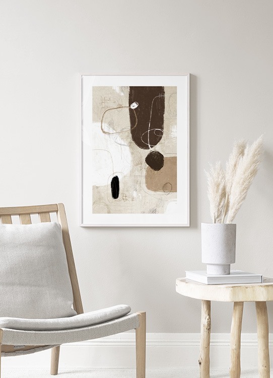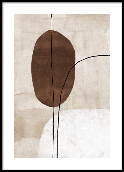 Handpicked Abstrakte Malerei mit braunen, schwarzen und weißen Formen sowie Bleistiftstrichen auf einem beigen Hintergrund. Zusammen mit seinem passenden Zwilling Art Shapes No2 ist dieses Poster ein toller Blickfang in einem modernen Zuhause!