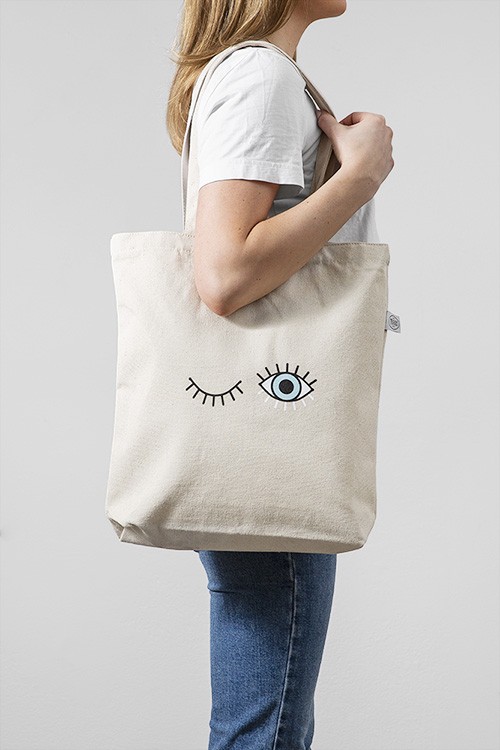 – Beige Tote Bag mit einem offenen, blauen Auge und einem geschlossenen Auge auf der Vorderseite