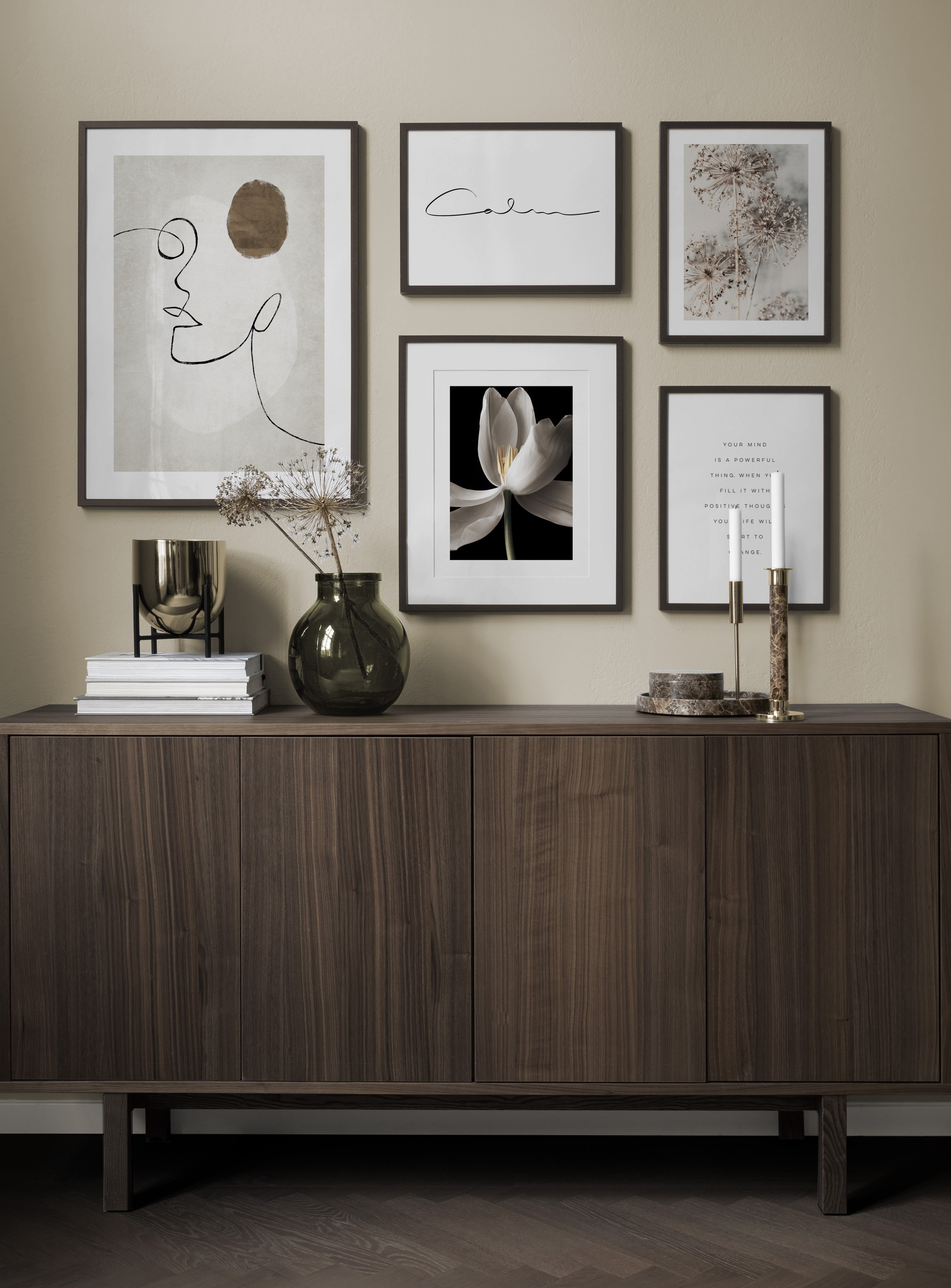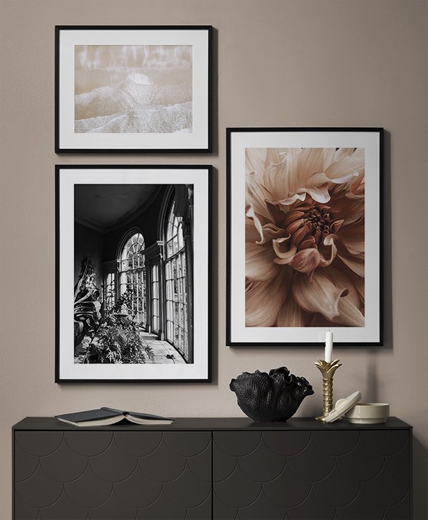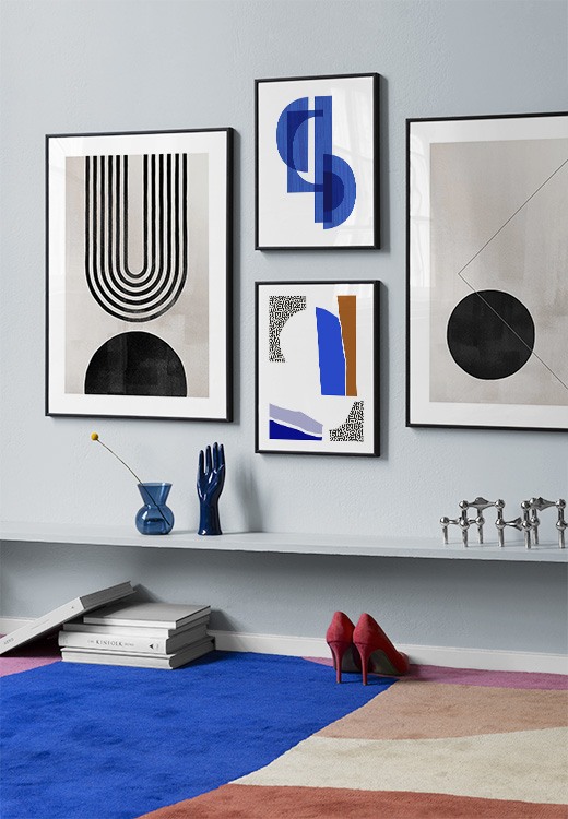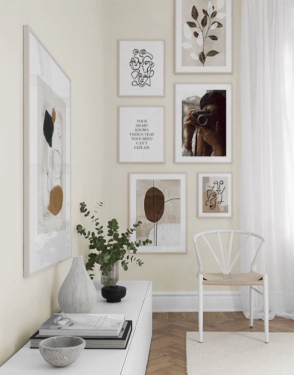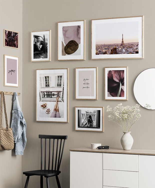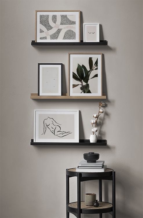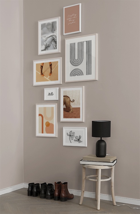 Einer unserer Geheimtipps ist, Kunst auf Regale, auf der Garderobe u. a. anzuordnen. So vermeidest du Löcher in den Wänden! Stelle die Bilder auf der Flurkommode oder an die Wand gelehnt auf einer Ablage auf und gestalte ein ansprechendes Stillleben rund um deine Kunst. Auf diese Weise kannst du deinen Flur leicht an die Jahreszeit und deine Stimmung anpassen. Wenn Du deine Kunst lieber an die Wand hängen möchtest, kannst du eine moderne Bilderwand gestalten. Ob große oder kleine Wände - bei uns findest du eine passende Lösung.