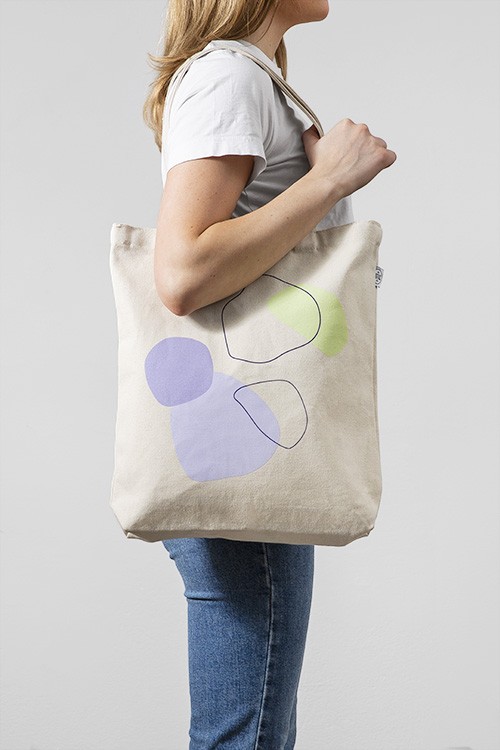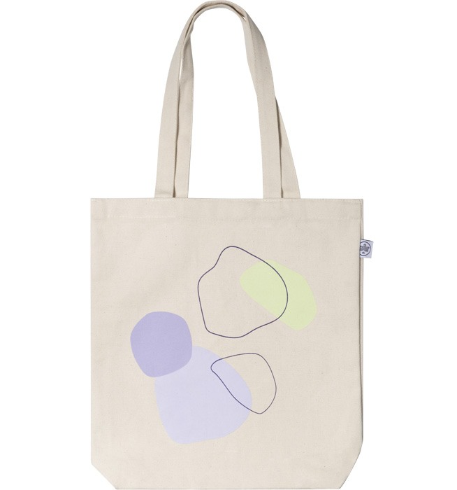 Handpicked Tote Bag in natürlichem Beige mit lila und grünen abstrakten Formen. Mit einer trendigen Tote Bag macht Einkaufen mehr Spaß, sie ist außerdem nachhaltig und modern! Die Stofftaschen aus unserer limited Edition wurden in Schweden bedruckt und bestehen zu 100% aus recycelter Baumwolle.