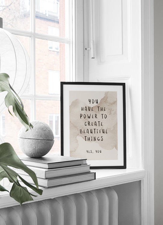 Ab 5,57 €Textposter mit dem Zitat 'You have the power to create beautiful things. Yes, you' in Schwarz auf beigem Aquarellhintergrund. Umgib dich mit inspirierenden Zitaten und erlebe die Kraft, die von ihnen ausgeht, überall in deinem Zuhause!