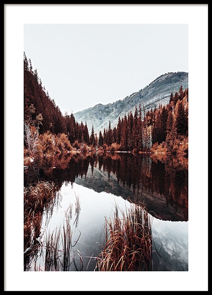 Handpicked Fotografie, die einen See im Sonnenuntergang zeigt, im Vordergrund rote Bäume, im Hintergrund Berge. Dieses großartige Poster fängt die Schönheit der Natur und die Wunder, die sie zu bieten hat, ein. Gönne deinen Wänden mit diesem warmen Poster ein wohlverdientes Facelift, die perfekte Wahl für das Zuhause von Naturliebhabern.