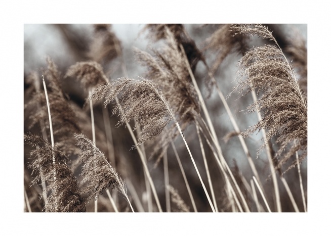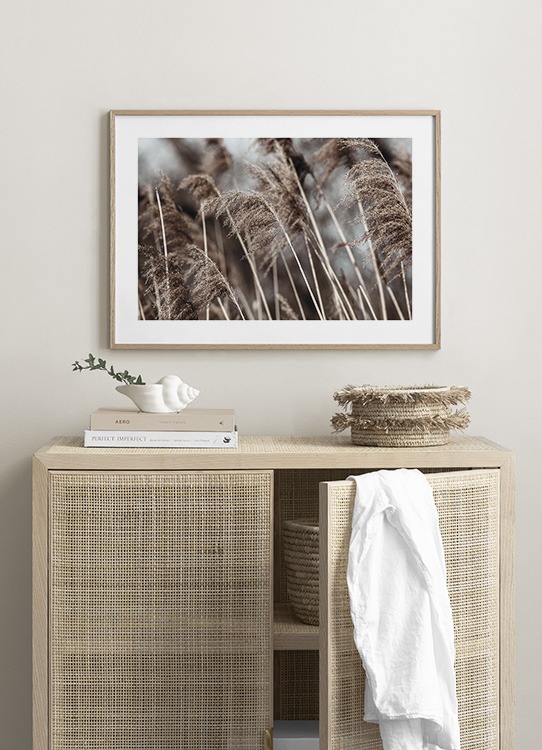 Handpicked Fotografie von beigen, getrockneten Gräsern mit hellgrauem Hintergrund. Getrocknete Gräser sind ein Trend, der uns noch lange begleiten wird, und wenn du einige in einer Vase auf deinem Couchtisch hast, kannst du sie mit passenden Postern kombinieren.