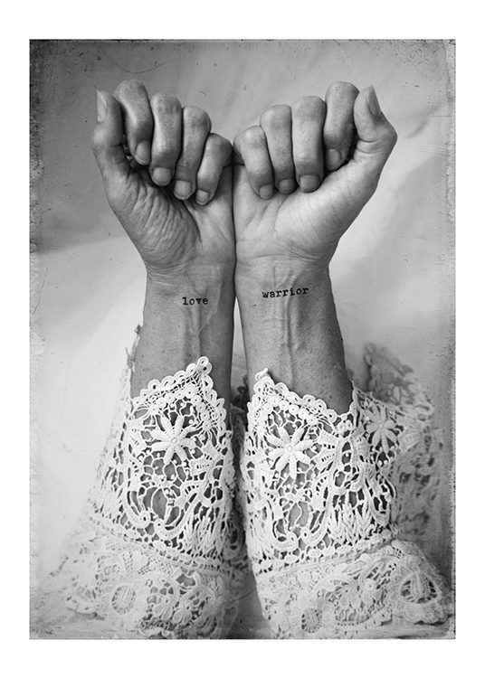 Handpicked Der Print Dogma von Love Warriors ist ein schwarz-weißes Fotoposter. Es zeigt zwei Hände mit der Tätowierung ?Love Warrior? auf dem Handgelenk. Das Kreativteam von Love Warriors reist um die ganze Welt, immer auf der Suche nach Inspiration und schönen Dingen, die ein schwedisches Publikum ansprechen. Desenio bietet ein ausgewähltes Sortiment von LWs Fotokunst an. Dogma bezieht seine Inspiration von Hunter S. Thompson. Der Journalist ist hat einmal gesagt, dass wir aufrecht stehen müssen und niemals diejenigen vergessen dürfen, die uns den Weg geebnet haben ? auf der Suche nach Wahrheit und im Kampf für die Liebe. Das Poster hat einen ?integrierten? Passepartout, der dem Motiv einen schönen Rahmen gibt.