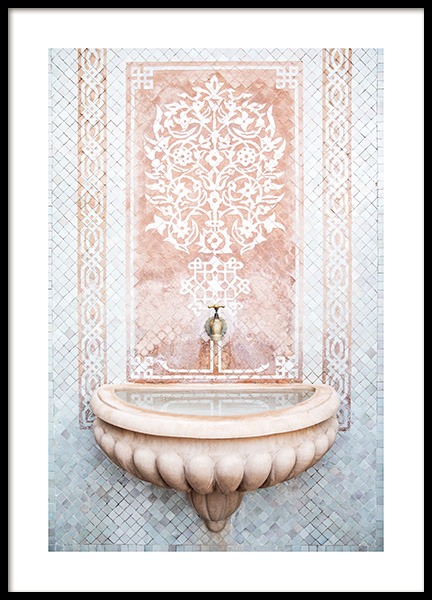 Handpicked Fotografie eines Pools in einem Raum mit goldenen Lampen, blauen Säulen und weißen, geschwungenen Bögen. Dieser geheime Ort verbindet großartige Traditionen mit Kunstfertigkeit, sodass wir uns immer wieder neu verlieben. Das Poster gehört zu Studio Amara, einer Fotokollektion, die vom Desenio Design Studio in Marrakesch aufgenommen wurde.