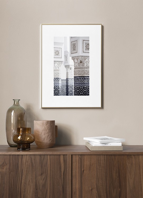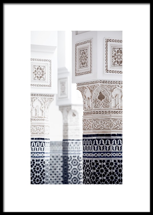 Handpicked Fotografie mit der Nahaufnahme von Säulen mit blauen und weißen Mustern. Mit zarten Pastelltönen und schönen Mustern bringen Fotografien aus Marrakesch einen ganz neuen Look in dein Zuhause! Das Poster gehört zu Studio Amara, einer Fotokollektion, die vom Desenio Design Studio in Marrakesch aufgenommen wurde.