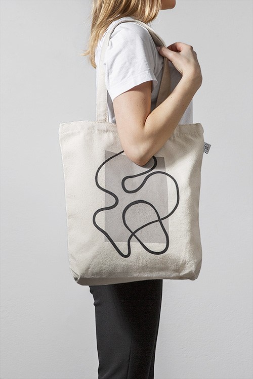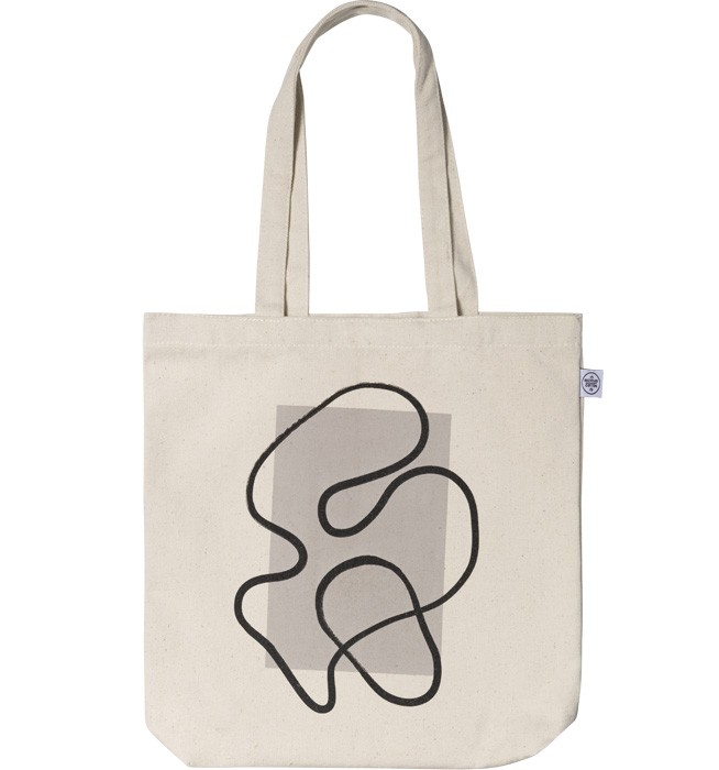 Handpicked Tote Bag in natürlichem Beige mit einem schwarzen Wirbel auf einem Rechteck in dunklem Beige. Eine Tote Bag ist die Rettung für spontane Einkäufe! Die Stofftaschen aus unserer limited Edition wurden in Schweden bedruckt und bestehen zu 100% aus recycelter Baumwolle.