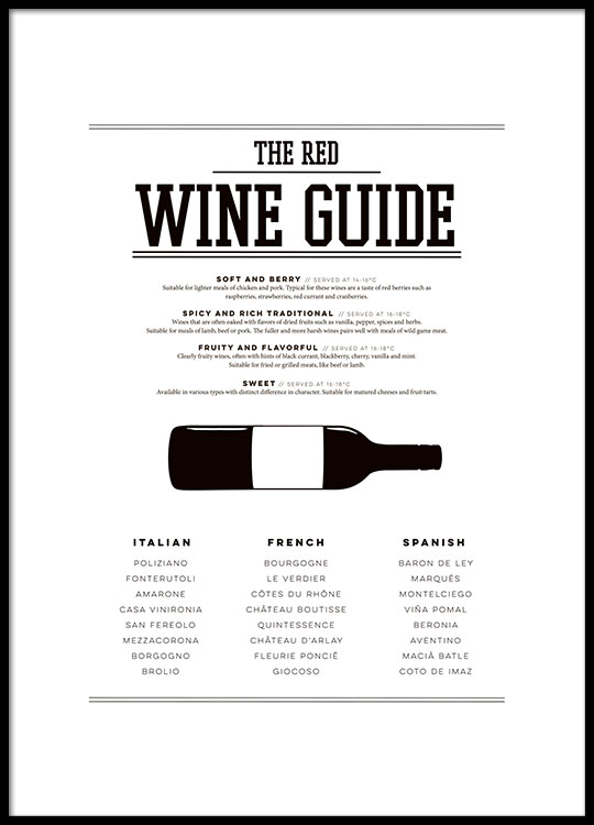 Ab 9,10 €Poster mit Wein-Ratgeber für Rotweine. Dieses Poster ist ein Muss für jede Küche und passt gut zu anderen Küchenpostern, wie z.B beef cuts oder lamb cuts! Dieses Küchenposter lässt sich in einem wei?en oder schwarzen Bilderrahmen zudem leicht mit anderen Postern mit Küchenmotiven zu einer Bilderwand kombinieren. Ein modernes Poster, das deiner Küche das gewisse Etwas verleiht. Das Motiv ist auf hochqualitatives unbeschichtetes Papier gedruckt.