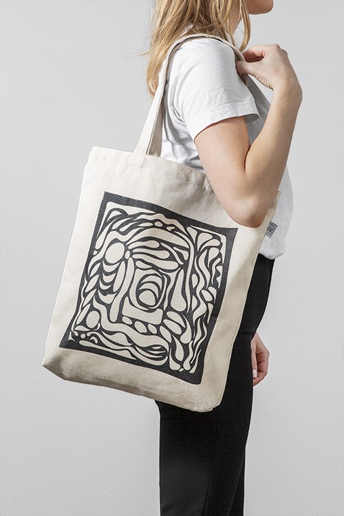 – Beige Tote Bag mit einer abstrakten Illustration in Schwarz, die auf der Vorderseite aufgedruckt ist