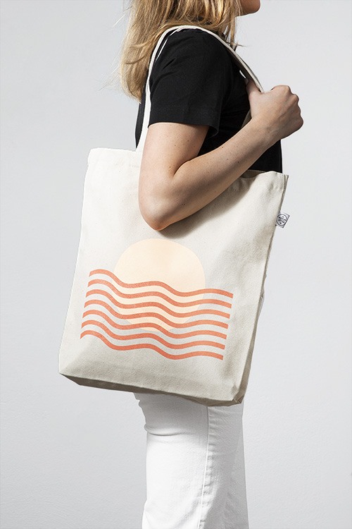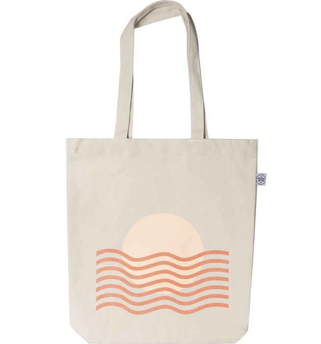 – Beige Tote Bag mit einem Druck auf der Vorderseite, der einen Sonnenuntergang und Wellen in Orange zeigt