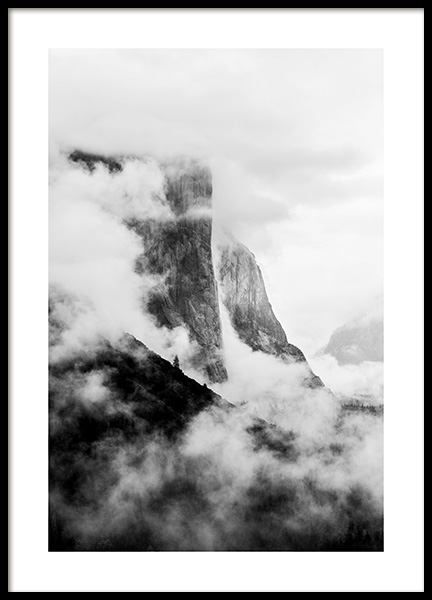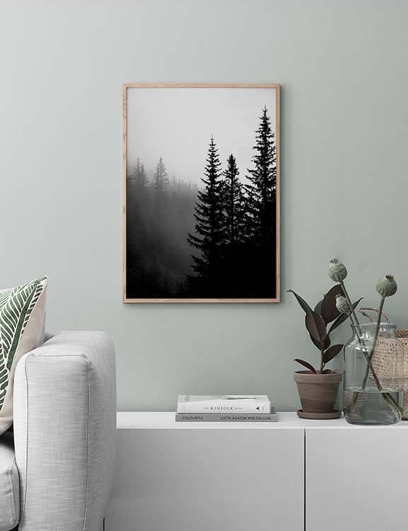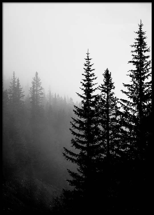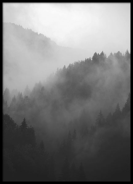 Schwarz-Weiß-Fotografie mit einem in Nebel gehüllten Nadelwald. Die schönen Grautöne der dunklen Tannen und des sanften Nebels lassen sich wunderbar mit weiteren Motiven kombinieren.