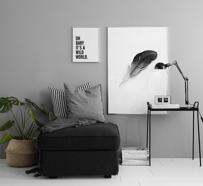 Posters, affischer i svartvitt. Snygg tavla med fjäder. Nordisk inredning.