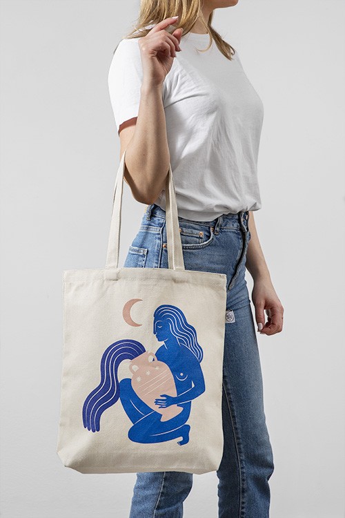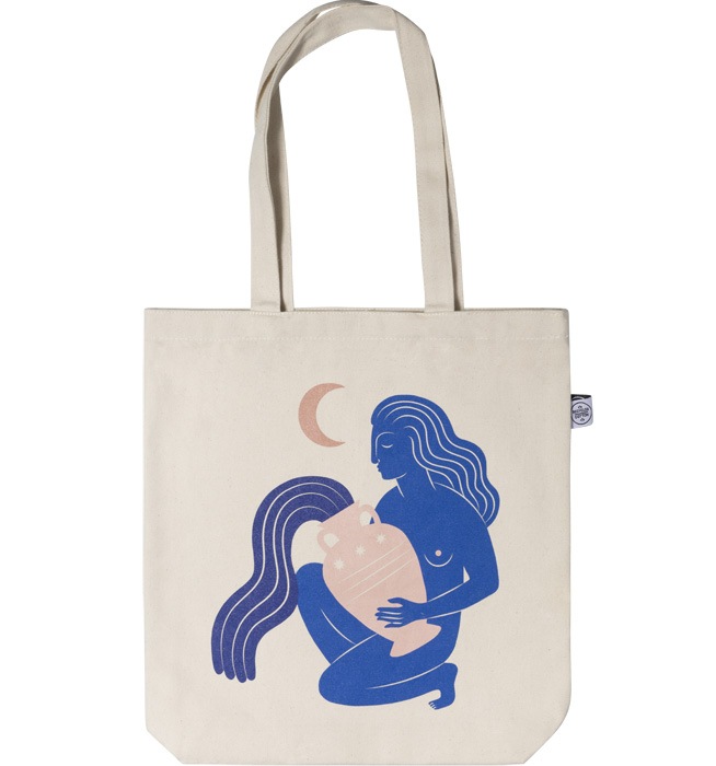 Handpicked Tote Bag in natürlichem Beige mit einer Frau, die Wasser aus einer Vase schüttet, gemalt in Blau, über ihr ein Halbmond. Mit einer bunten Tote Bag macht Einkaufen mehr Spaß! Die Stofftaschen aus unserer limited Edition wurden in Schweden bedruckt und bestehen zu 100% aus recycelter Baumwolle.