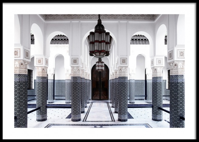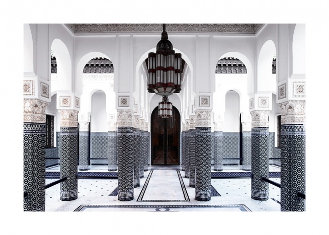 Handpicked Fotografie von blauen und weißen Säulen in einem Raum mit einer schwarzen Tür und einer Lampe an der Decke. Wenn du ein Fan von alter Architektur und geheimnisvollen Winkeln bist, haben wir alles, was du suchst! Das Poster gehört zu Studio Amara, einer Fotokollektion, die vom Desenio Design Studio in Marrakesch aufgenommen wurde.