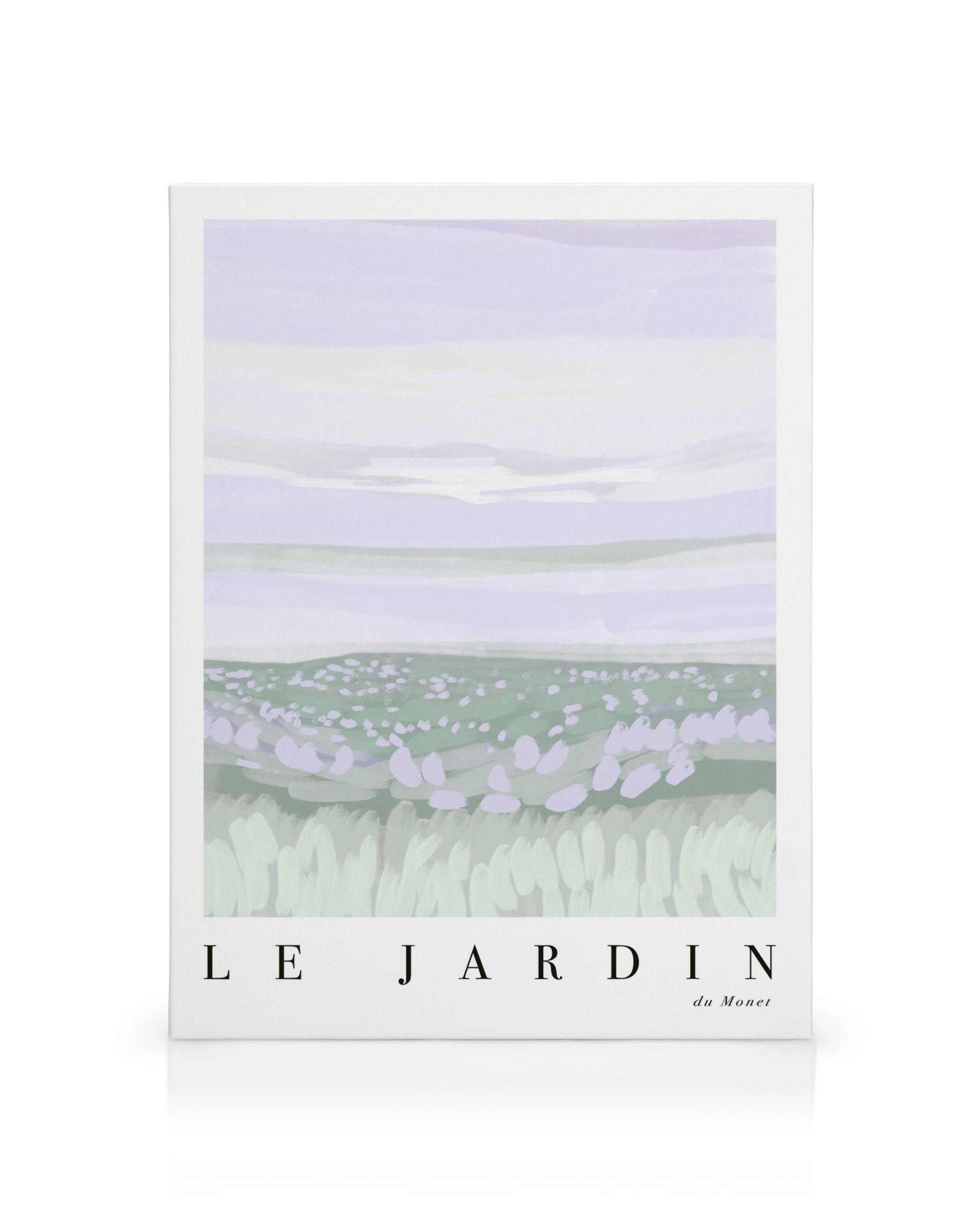Leinwand einer magischen lila-grünen Wiese mit lila Himmel und dem Text 'Le Jardin Du Botrain' in schwarz. Ein Le Jardin Wandbild ist ein Muss für dein Zuhause! Perfekt kombiniert mit Le Jardin No7.
