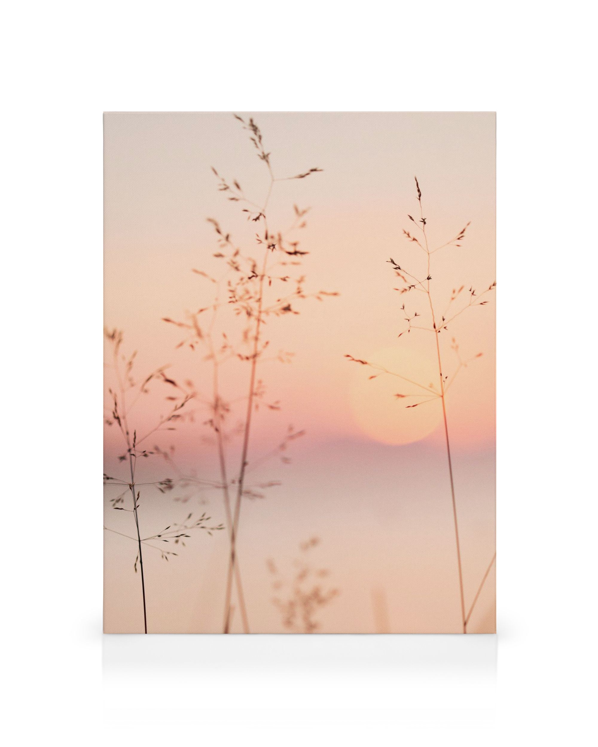 Fotografie mit filigranen Grashalmen, einem Himmel in Rosa, Orange und Lila sowie der Sonne im Hintergrund. Mit Leinwandn in sanften Pastelltönen kannst du deinem Zuhause ein frisches Flair verleihen, ohne dass sie dominierend wirken.