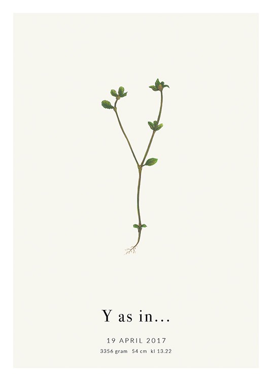 Illustration einer Pflanze in der Form des Buchstabens Y auf einem hellbeigen Hintergrund mit Text am unteren Rand. Mit personalisierten Postern kannst du dein Poster ganz persönlich gestalten. Du kannst eigenen Text, eigene Namen oder Daten hinzufügen. Eine tolle Möglichkeit, dein eigenes Poster zu personalisieren oder anderen ein wirklich persönliches Geschenk zu machen.