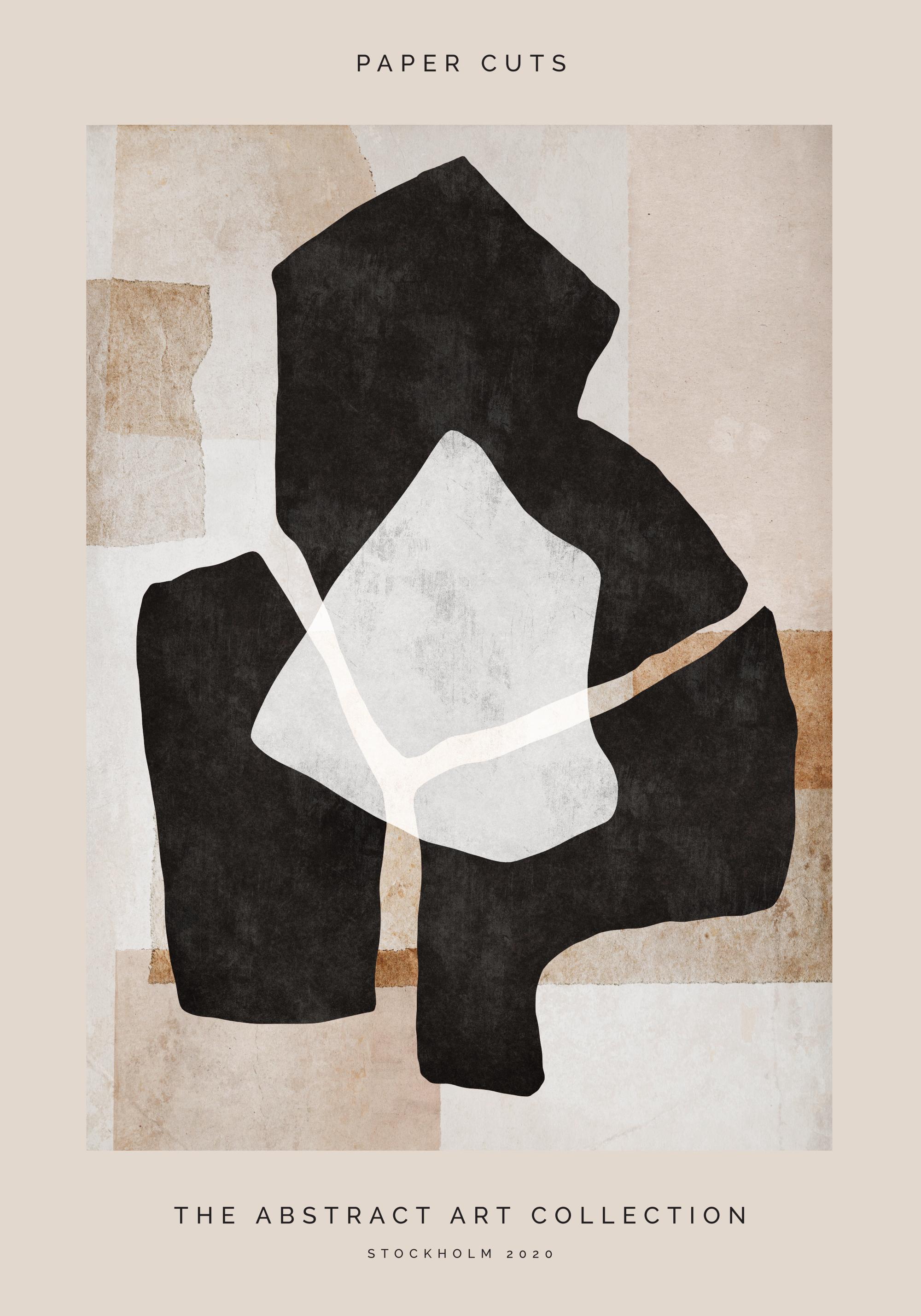 Abstrakte Illustration mit Papierstücken in Schwarz und Weiß auf einem beigen Hintergrund und Text darüber und darunter. Kennst du das? Bei der Auswahl von Postern kann die Farbzusammenstellung wirklich eine Herausforderung sein. Dieses Poster passt aber wunderbar zu Paper Cuts No1, sodass du gar nicht weiter überlegen musst.
