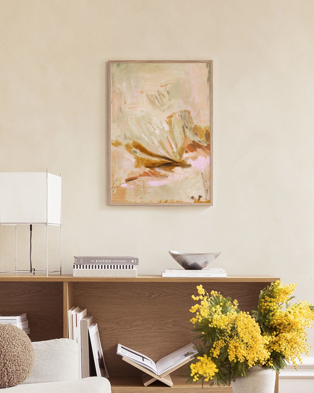 Sanftes abstraktes Poster mit Pastellfarben auf hellbeigem Hintergrund. Mit Pinselstrichen in Rosa und Braun und sanften geschwungenen Linien, die ein ruhiges und fließendes Gefühl schaffen.