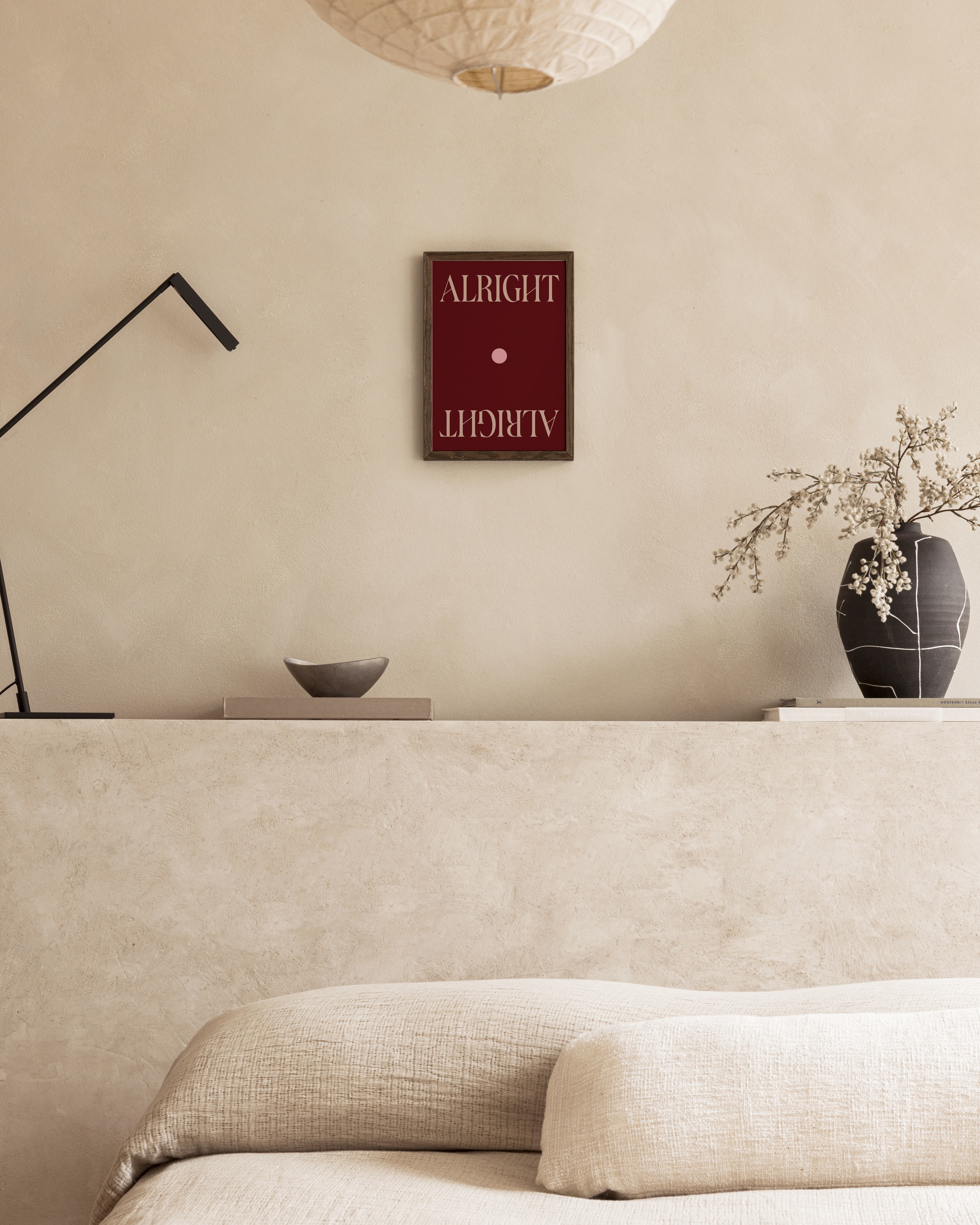 Ab 9,98 €Ein trendiges Poster mit dem Wort "ALRIGHT" in hellbraunen Buchstaben auf einem dunkelroten Hintergrund mit einem rosa Punkt in der Mitte.